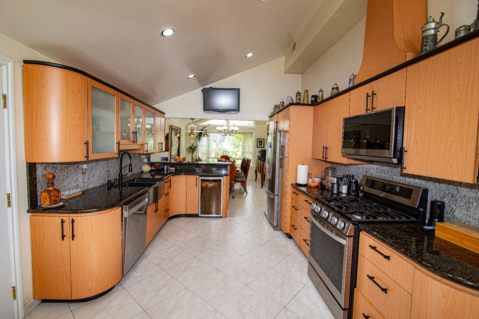 Nestled on a tranquil cul-de-sac in Porter Ranch, this exquisite split-level pool home offers breathtaking mountain views and luxurious living. With 4 bedrooms and 3 bathrooms, the residence boasts 2,435 sq ft of living space on a sprawling 16,787 sq ft lot. The home features soaring ceilings, upgraded recessed lighting, and elegant tile flooring, complemented by stylish plank flooring. The gourmet kitchen is equipped with stainless steel appliances, a large island with a gas cooktop, and a breakfast nook, which is ideal for entertaining. The backyard oasis features a sparkling pool, a relaxing Jacuzzi, a mini waterfall, and an expansive deck with a delightful sitting area showcasing stunning 180-degree views. The patio area includes a shaded space with lighting adjacent to an outdoor gas grill, perfect for al fresco dining and relaxation. The property boasts beautiful landscaping in both the front and back yards, featuring a variety of climate-tolerant plants, ensuring vibrant curb appeal and a sustainable outdoor space. Multiple hiking trails in the surrounding area. Located just minutes from award-winning schools, including Castlebay Lane Elementary and Granada Hills Charter High School, this exceptional home offers the perfect blend of luxury, comfort, and convenience.