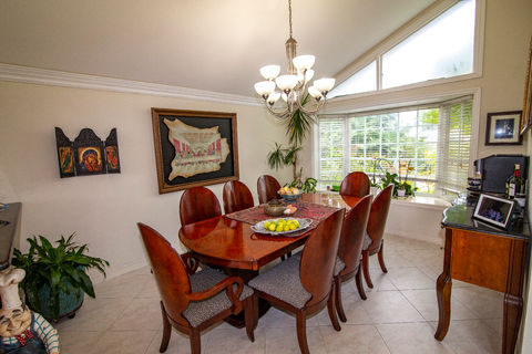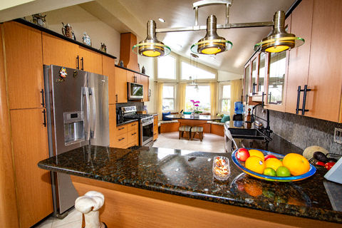 Nestled on a tranquil cul-de-sac in Porter Ranch, this exquisite split-level pool home offers breathtaking mountain views and luxurious living. With 4 bedrooms and 3 bathrooms, the residence boasts 2,435 sq ft of living space on a sprawling 16,782 sq ft lot. The home features soaring ceilings, upgraded recessed lighting, and elegant tile flooring throughout, complemented by stylish plank flooring. The gourmet kitchen is equipped with stainless steel appliances, a large island with a gas cooktop, and a breakfast nook, which is ideal for entertaining. The backyard oasis features a sparkling pool, a relaxing Jacuzzi, a mini waterfall, and an expansive deck with a delightful sitting area showcasing stunning 180-degree views. The patio area includes a shaded space with lighting adjacent to an outdoor gas grill, perfect for al fresco dining and relaxation. The property boasts beautiful landscaping in both the front and back yards, featuring a variety of climate-tolerant plants, ensuring vibrant curb appeal and a sustainable outdoor space. Located just minutes from award-winning schools, including Castlebay Lane Elementary and Granada Hills Charter High School, this exceptional home offers the perfect blend of luxury, comfort, and convenience.
